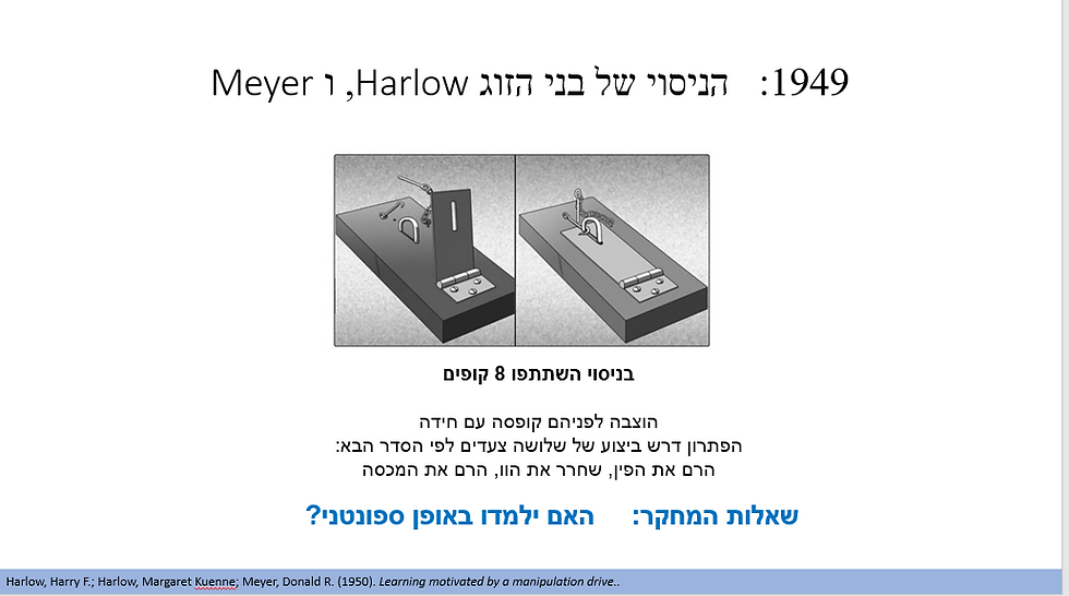דוגמה: קופים הוכנסו לכלוב. הם היו שבעים ואחרי שנת לילה - ללא שום דחק. הונחה לפניהם קופסה עם חידה. לא אמרו להם כלום, לא רמזו לא הציעו. האוטונומיה שלהם איך לפעול היתה מוחלטת. מה קרה? הקופים ניגשו לקופסה, החלו לחקור אותה , ובסוף התהליך למדו לבצע סידרה של 3 צעדים שאיפשרה את פתיחת הקופסה (קריטריון ברור להתקדמות).